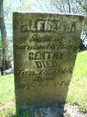Another pioneer family to Jackson Township are the Gentrys whose homestead is featured on the Jackson Township history page. The Gentrys settled just east of Perkinsville on the north bank of White River in 1827 along the trail known as North Bank Road. This trail had been used for ages, long before white settlers came, by Native Americans traveling on foot going from what is now Gentryville, Ohio, to the area that became Chicago, Illinois. North Bank Road, now designated as CR 280N, mirrors South Bank Road, now referred to as W. 8th Street. North Bank Road gave way to South Bank Road in popular use only when pioneers started entering the New Purchase of Indiana using ox-drawn wagons: South Bank Road was flatter. Among the Gentrys buried at the Neese Cemetery are Samuel, who died October 24, 1865, at "67 years," and Elizabeth, who was born March 31, 1798, and died June 11, 1856.