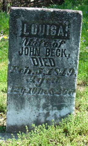 Among the other early settlers to Jackson Township buried here are the Browns: Lewis, who died in 1879 at "70y 11m 1d," and Sophia, who died in 1911 at ninety years of age; the Folands: Eliza, who died in 1867 at "60y," John, who died in 1856 at "50y," and Valentine, who died in 1852 at "43y"; Thomas Crab/Grab, who died March 17, 1857, at "62y"; and Catherine Knopp, who died in 1869 at "72y." Another early family, the Simmonds/Simmons, have a sad distinction: female member Cora Simmons had to have been one of the first burials in the land that became the Neese Cemetery. She was just six years old when she died in 1830.