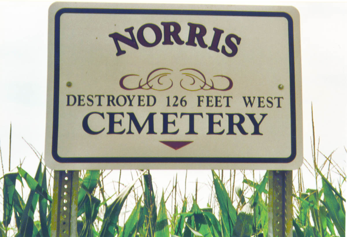 This picture tells the story. The Norris Cemetery, once a remote family burial ground in the 19th century, found itself as part of a farmer's field in the late 20th. The land owner became tired of having to avoid the burial ground when working the land, so he cast the stones away and plowed over the graves. In the early 20th century, he was not prosecuted since laws protecting pioneer cemeteries were not enacted until 1973. The metal road sign, pictured above, memorializes the location of the Norris Cemetery and decries the desecration of what should have been sacred ground. The list below is partial. |