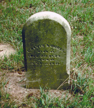 The only stone from the Norris that was not completely destroyed is the one pictured left. Since the original Norris burial ground is now part of a field for growing corn and soybeans, Calvin Norris's marker was placed as a memorial in the Walker Cemetery, the closest pioneer graveyard to the original location of the Norris. Calvin died August 20, 1874, "aged 58 y. & 14 d." His stone is just inside the gate of the Walker which is on CR 1250N between CR 300E and 350E. |