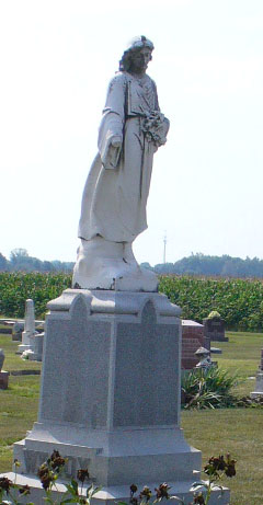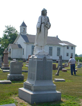 William Cox, born in Ohio, October 1821, came to the New Columbus/Ovid area in the 1840s and married in 1845 Martha Preston, born 1826 also in Ohio. The couple eventually purchased the Samuel Jackson farm in nearby Fall Creek Township. Their children were Abijah, Tunis, William P., Martha F., Jasper N., Robert, Wesley T., and Isaac W. The latter died in 1876, and his stone is in the center above. County historian Samuel Harden was "glad to notice this family, one of the highest respectability and worth" in his book The Pioneer. The father William died in 1909, and his marker is surmounted by an "angel or woman in mourning"--as the Victorians would say-- shown above left and right. The pretty statue, which is positioned close to the road, CR 600E, has become something of a landmark.