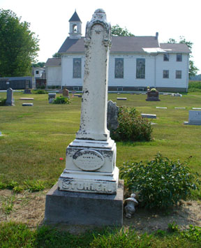 Sarah Baker was born in 1849 and died in 1874. Her pretty stone points to the Mt. Zion Lutheran Church in the background of the photo. The interestingly shaped monument has at the top a square containing chalices or urns. In Victorian funerary symbolism these represented Sarah's full, rich life. They could also stand for the rich history of the church, which closed its doors in 2001 after holding services for the people in south central Madison County for over 140 years. |