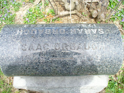 An unrecorded early settler to the local environs must also have been Sarah Orbaugh since she left this life while living in or near Pipe Creek Township in 1849; she was fifty-three. Isaac and Sarah (Tusing) Orbaugh/Orebaugh have a 20th century cylinder style marker most likely erected by descendants who wanted to honor their ancestors. Isaac's date are 1806-1859; Sarah's are 1796-1849. Below Sarah's data is the data for daughter Nancy Ellen. Since Nancy Ellen was born and died in 1849, the same year as Sarah's death, it could be assumed that mother and daughter died in or from complications during childbirth. Descendant and family genealogist Oscar Nye in Boise, Idaho, says that the greater Orbaugh family "started in Maryland and Virginia, then moved to Indiana, Kansas, Canada, Washington, Arkansas, California, Oregon, and Idaho. I know there are more Orbaughs buried...at the Whetstone, City of Elwood, and Sigler cemeteries."