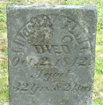 At left is the stone for Elizabeth "wife of Joseph Flint, died Feb. 11, 1835 aged 51 yrs. & 10 ms." Another stone for the Flint family, with very legible and attractive script, is that for Charity, left middle; she died "Oct. 2, 1842, aged 32 yrs. & 21 ds." Representing the many children buried here is Mahala whose stone reads, "Daughter of Stephen & Mary Cox. Died Aug. 18, 1853 Aged 3yrs. 5 mo. & 25 D." William Montgomery's stone is at far right. He died "Feb. 25, 1844, in the 63 years of his life." That last phrasing is unique for the grave markers in Madison County.