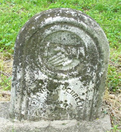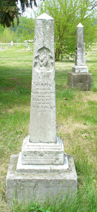 Others in the same period were seventy-one year old Jacob Little and eighty-six year old Mary Little, who died in 1887 and 1872 respectively. At right is the marker for Mary Little "wife of Peter Little." She was eighty-six years old when she passed away September 16, 1872. That would make her birth year circa 1786. At the top of her stone is a hand with the index finger pointed heavenward, representing her place of residence in death. |
