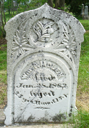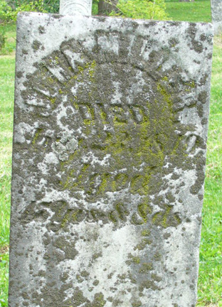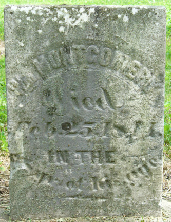 Indeed, the earliest legible gravestone is that of Elizabeth Flint who at fifty-one years of age died in 1835. Of course, as in any pioneer cemeteries, there are graves without markers. Logically, any number of those could be interments before that year. The next oldest stone, however, is that for five year old Deborah Mills who followed in 1836. Many of the earliest stones, in fact, are those for children. In the first half of the 19th century, the death rate for those not yet in their adolescence could run as high as one in three. The records of the Prewett bare witness to that high percentage among the young. The Mills family lost three more children before 1853, and the Montgomery family lost a total of six before 1854. The family of William Montgomery, c. 1781-1844, is listed as one of the first to settle in the township before 1840. William is buried here along with his wife who died in 1849.