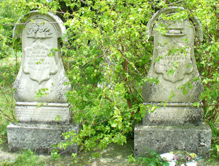 Although encroached upon by mulberry bushes, the beautiful markers for William and Sarah Prewett can still be appreciated. William, who died November 14, 1863, was sixty-eight years old, making his birth year around 1797. His wife Sarah died October 1, 1861, at sixty-five years, making her birth year about 1796. Their gravestones are Victorian in style: curving lines, arched tops, medallions for the data, and symbols--the flowers, representing love for Sarah and the Bible for William's faith. The markers are also large indicating that the Prewetts were wealthy and successful. Even the faint remnants of a customary verse can be detected above the dark gray bases. Judging by the pink silk flowers at the foot of William's stone, someone has been doing his/her genealogy. |