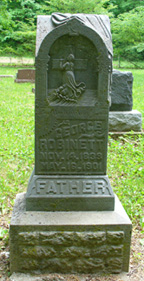 George Robinette, 1839-1901, listed below, son of Lemuel, Sr., lived all of his life in Jackson Township on or near land settled by his family, specifically the north bank of White River. His land overlooked the beautiful valley between Madison County and Hamilton County, the valley being on the opposite side of the river. George married Cynthia Miller, 1849-1898, and they had five children: John, Lillie, George, Lydia, and Georgie. According to historian Samuel Harden, "Mr. and Mrs. Robinette belong to the M.E. [Methodist Episcopal] Church, and are highly respected wherever known. Mr. R. is a good farmer, having lived on a farm all his life." George, his wife, and some of his children are buried with their ancestors, relatives, and neighboring friends here at the Robinette.