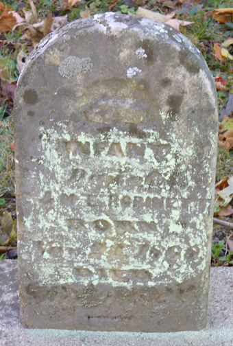 Rebecca Robinette's stone, center below, is flanked by the stones of two Robinette children, an infant, left, and Mary Emily, right. Rebecca died in 1866 at forty-three years of age.