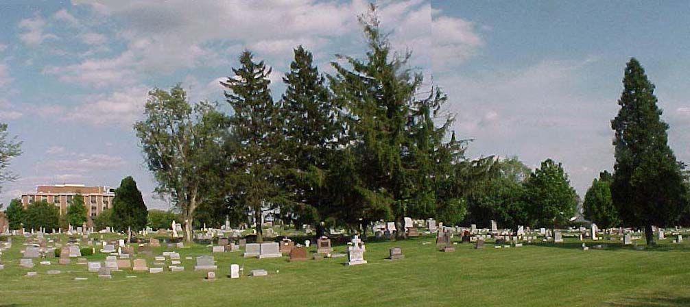 This picture of St. Mary's Cemetery was taken looking to the east. A St. Vincent's Hospital building is in the background on the left. The hospital is across the street from the entrance to the cemetery.
