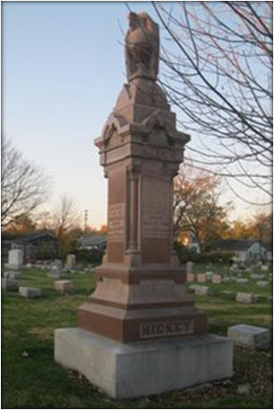 Hickey and his wife Maria were Catholic, and both are buried at St. Mary's. Maria had become seriously ill in the early 1890s, and the Sisters of the Holy Cross nursed her at the Hickey farm home. After Maria died in 1894, John deeded the farm to the Sisters for use as a hospital for the community. They actually used his frame farm house as their first hospital building. Thus we have the beginnings of Anderson's St. John's Hospital which eventually was purchased by the St. Vincent's network. In the main entrance area to the modern building, there is a life-size, detailed mural on the north wall depicting the farm as it looked in the early 1890s. John Hickey, his family, the Sisters, the buildings, and all the animals are presented as they looked in real life.