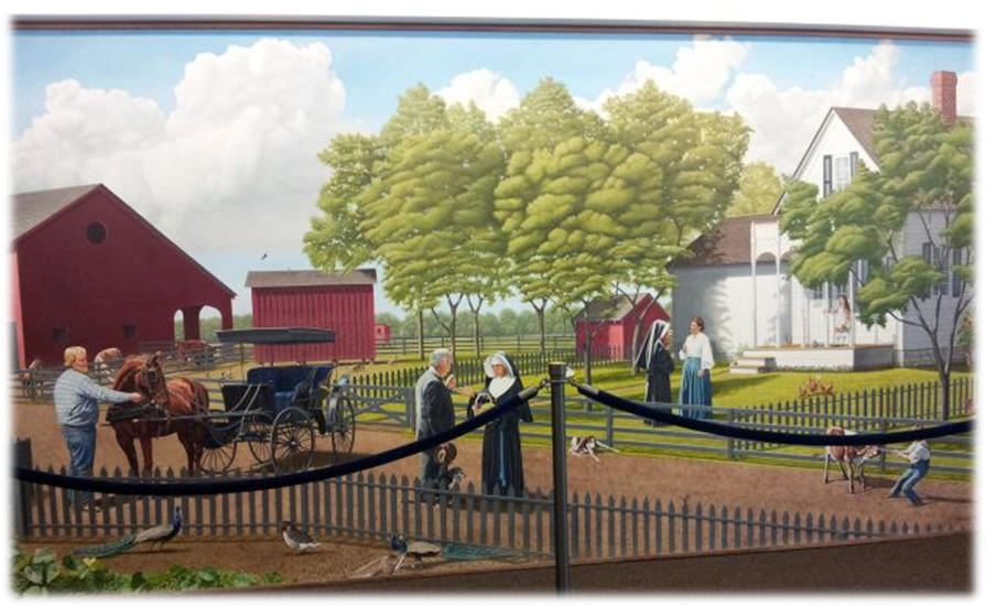This is the life-size mural of John Hickey, his family, the Sisters, animals, and farm as it looked in the early 1890s. John Hickey gave his farm in 1894 to the Sisters of the Holy Cross for use as a hospital for the benefit of all area residents. The white farm house on the right was actually used as the first St. John's (now St. Vincent's) Hospital. This highly detailed mural is on the north wall of the entry foyer. |