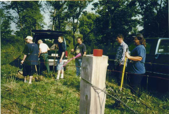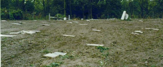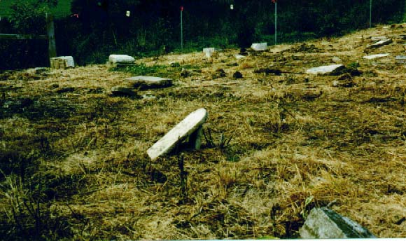 | Above: After the floor plan for the original cemetery had been charted, the stones were removed to a safe place, in this case the newly erected fence, in order to begin grading the uneven earth. |