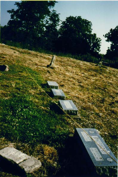 The final product: To help protect the Weddington Cemetery in the future, trees and undergrowth were taken out from the perimeters as well so that its location could be seen by anyone traveling on CR 200W. Sitting on top of one of the highest hills in the locality, the Weddington's gravestones now appear as soft white pillars against the dark wooded background--a visible symbol of early Hoosier history. Go to Weddington Rededication Ceremony page for more pictures. |