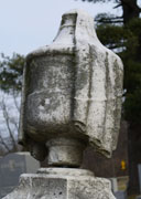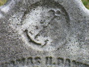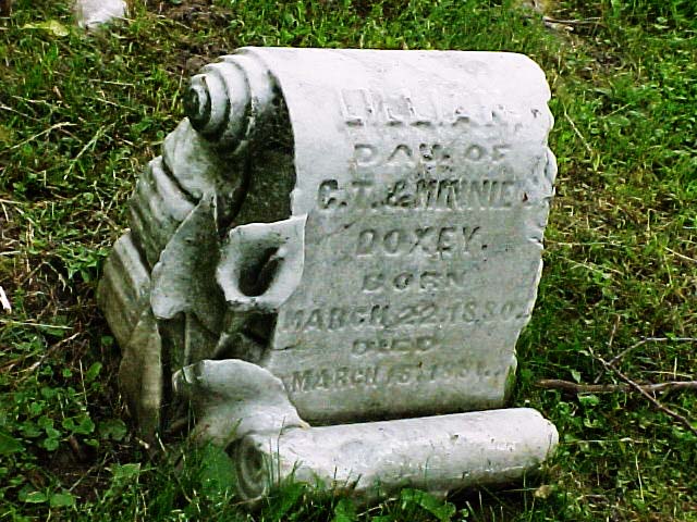 This marker for a member of the Peter H. Lemon family is another excellent example of high Victorian style. Although easier to sculpt and cut, the white, softer marble, popular during the period, shows the destruction incurred from time and weather. The stone has broken and in places has faded and dissolved. A trial for genealogists, stones made of this material often lose the valuable family information sometimes included. Unfortunately, it looks like this stone once held an entire story. The image at the top, left, was probably an angel. |