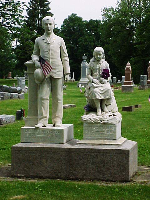 Gertrude Pauline and Charles Ingersoll Hilligoss both died in the 1880s. Their father Dr. Hilligoss commissioned these stone portraits that face busy Grand Avenue. The statues can easily be seen by travelers. The column Charles is leaning on symbolizes a noble life; Gertrude's book stands for the divine word. "The Children" have become something of a land mark in the north Anderson area. Their likenesses are always decorated, as seen in this photo, with the appropriate symbols and garlands for the holiday or season. One does not have to be a relative or cemetery commissioner to appreciate the people who have come before. |