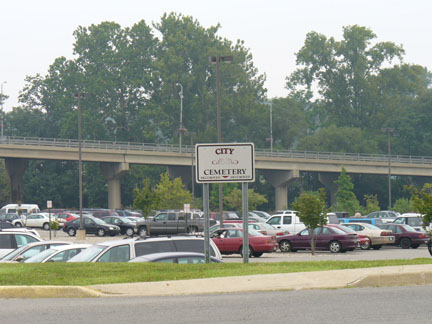 At left, the first cemetery for Anderson residents was called City or Bolivar Cemetery. It was on the west bank of White River at the end of what was once called Bolivar Street. Undergoing many changes over the decades, this location is now used for a parking lot for business offices. When mid 19th century necessity demanded, those buried at the City Cemetery were re-interred at the Tharp (see below). |