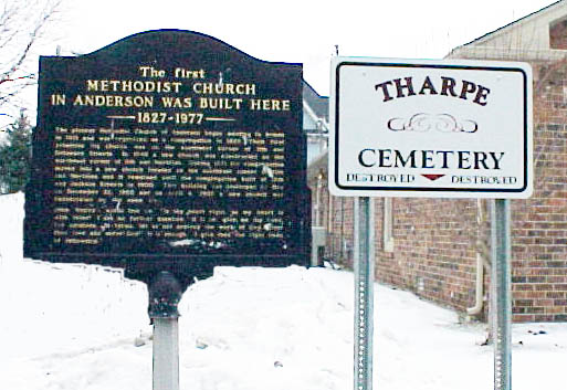 Removed in 1863 to give way for Anderson's development, the Tharp/Thorpe/Tharpe Cemetery was located at Delaware and 11th streets. It was the burial ground for members of the first organized church in Anderson, the Methodist Episcopal. The land for both the church and its adjoining cemetery was donated by Collins Tharp. The MCCC sign and the Indiana Historic Marker, pictured right, are on the east side of the brick building housing the Chamber of Commerce, seen here in the background. The signs can be glimpsed while traveling south on what is now Brown-Delaware. The removed graves and their markers can be seen in the old section of West Maplewood. |