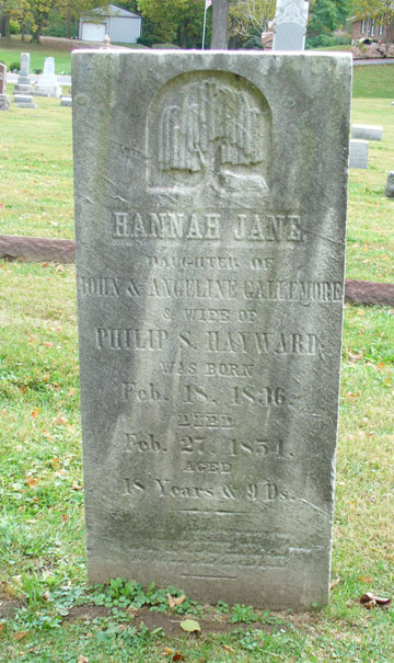 By contrast, right, Hannah Jane's extra tall vertical is still crisply preserved, and it has additional genealogy. She was the "daughter of John and Angeline Gallemore & wife of Philip S. Hayward, was born Feb. 18, 1836 died Feb. 27, 1854 aged 18 Years & 9Ds." Genealogists could not ask for more. |