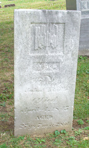 Starting in the 1840s, a soft white marble became more popular than the granite used previously; the marble was easier to cut. Sara Kindle's tablet type marker, left, has faded so much that her data is barely legible. She died "April 4, 1845 aged 27ys 7m & 28d." |