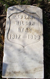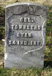 The stones above are not Federal, Victorian, or Edwardian. They are the military markers designed for veterans of the Civil War. These thick, gray to white tablets, on which a shield incases the personal data, can be seen from a distance as indicating the graves of Civil War veterans. From one family, the Ryans represent the many Madison County soldiers who helped preserve the Union.