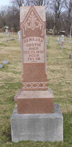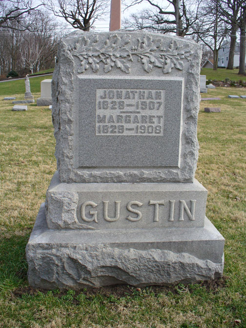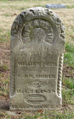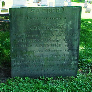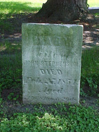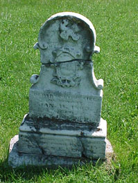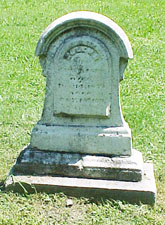 By far, the most common style of grave marker used in the first two-thirds of the 19th century for the average citizen--especially for those living in less affluent, rural areas--is the small, simple tablet like the one pictured at left and below. "Mary [Gustin] wife of John Stephenson died February 27, 1851, 71 ys 8 ms 20 ds"--just the inexpensive basics. Using the birth date instead of the person's age became the norm during the Civil War. Some transitional stones actually have all three: birth date, death date, and age. |