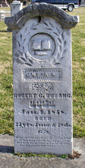 From the same carver or company, Julia Dusang's stone, at right, and Solomon Templin's, at left, are beautifully preserved in color and crispness. Julia's shows the bible which represents her religious faith; Solomon's adds the compass and ruler which indicate that he was a Mason. |