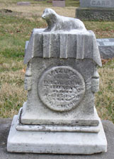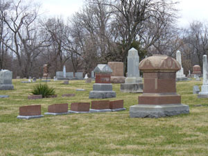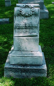 Overlooking the White River, the hill that is now part of West Maplewood was used for burials and the re-interment of the earlier Bolivar or City Cemetery and the Tharp Cemetery, both started in the 1830s. Many of the grave markers from these earlier burial grounds are still nicely preserved. James Tharp's stone from 1846 is an excellent example of the Federal Period's severe styling. This is a substantial tablet, almost three feet high and five inches thick, of brown granite. Granite, while hard to cut, retains the incising better than the softer white stone used from the middle of the 19th century on. Even the weeping willows and urns at the top are still beautifully visible after 160 years. |