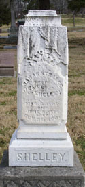 The obelisk, right, for Col. William Young and his wife Jemima is in excellent condition. William's data is on the west face; Jemima's on the south. William is listed along with Christopher and Isaac Young as a first land owner in Anderson Township, arriving in the 1820s. Historian Samuel Harden continues: "Colonel William Young, a very popular man, came to the county when a young man. He was quite well known throughout the county. He represented Madison County in the Indiana Legislature in 1846-47. He died August 20, 1863, aged sixty-six years, three months and twenty days. His wife Jemina, died November 23, 1851, aged fifty-two years, seven months and fifteen days; both buried at the Anderson cemetery [West Maplewood]." |