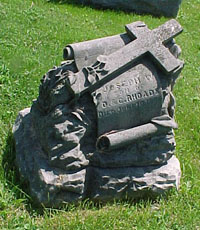 The ornate stones for one year old Lillian, above, and young adult Joseph, right, are complete with stacked rocks, scrolls, and lilies. The lilies stand for purity or chastity, and this variety was used so often at funerals and on markers that it is now sometimes referred to as a "death lily." Joseph's cross represents his religious faith, of course. |