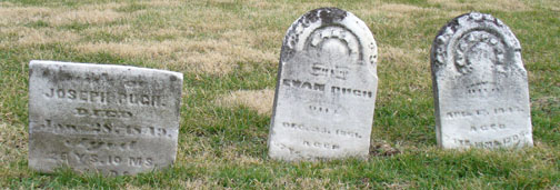 Elizabeth Pugh's stone also from 1838, on the left, and those of family members, on the right, show the beginnings of Victorian styling: the rounded tops decorated with flower motifs. Elizabeth's is a taller marker measuring around three feet high; those on the right are closer to two feet. This short, thick variety seemed to be popular in the 1840s. Evan Pugh's reads "died 1846," and Mrs. Joseph Pugh's reads "1849."