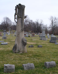The Victorian's use of images from nature on memorial architecture--like the rocks and flowers depicted above--reached a zenith toward the end of the 19th century with this version, at left. The VanWinkle family plot marker is a "tree cut-off." The individual members' stones, front and mid-ground, are rendered as the branches from the tree. |