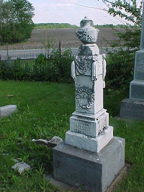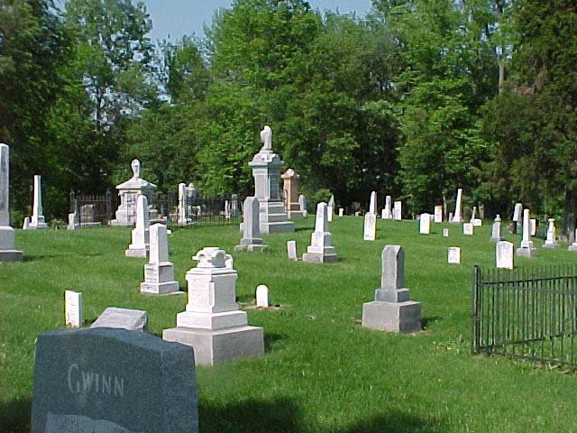 The Woodward-Gwinn Cemetery in Stony Creek Township is in excellent condition. It contains many of the early pioneer settlers to this area including the Fisher family whose wrought iron fence can be seen in the near foreground of the picture above. The Gwinn family section, also surrounded by wrought iron, can be seen in the middle. This cemetery has been in use through the Victorian era and into the modern day as evidenced by the Gwinn stone in the foreground. |