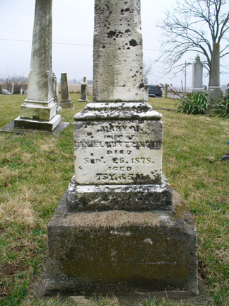 The stone for Daniel and Mary Huntzinger is pictured left and middle. Their union produced one daughter Mary who later wed Samuel Wolfe. Mary, Daniel's wife, died September 26, 1878, "75y 5m"; Daniel died a month later October 23, 1878, "81y 4m 17d." While Daniel and Mary and other Huntzingers lived out their lives here in the Hoosier state, the Graber family, according to Mr. Majors, moved to Alabama in 1884, leaving only one son buried next to relatives Daniel and Mary at the Woodward-Gwinn Cemetery.